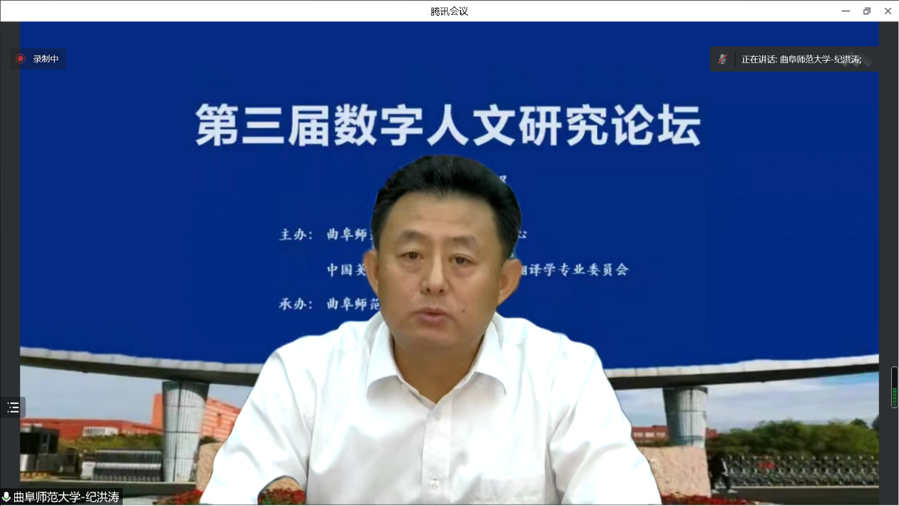 曲阜师大新闻中心讯(通讯员:张涛) 日前,第三届数字人文研究论坛在米兰网举办。本次论坛由曲阜师大数字人文研究中心与中国英汉语比较研究会语料库翻译学专业委员会联合主办,曲阜师大翻译学院与上海外语音像出版社承办。来自北京外国语大学、上海外国语大学、台湾辅仁大学、北京航空航天大学、上海交通大学、北京师范大学等数十所高校的数字人文研究专家齐聚云端,共同分享数字人文研究的新成果、新进展。米兰网党委常委、副校长纪洪涛出席论坛开幕式并致辞。开幕式由曲阜师大翻译学院院长夏云教授主持。