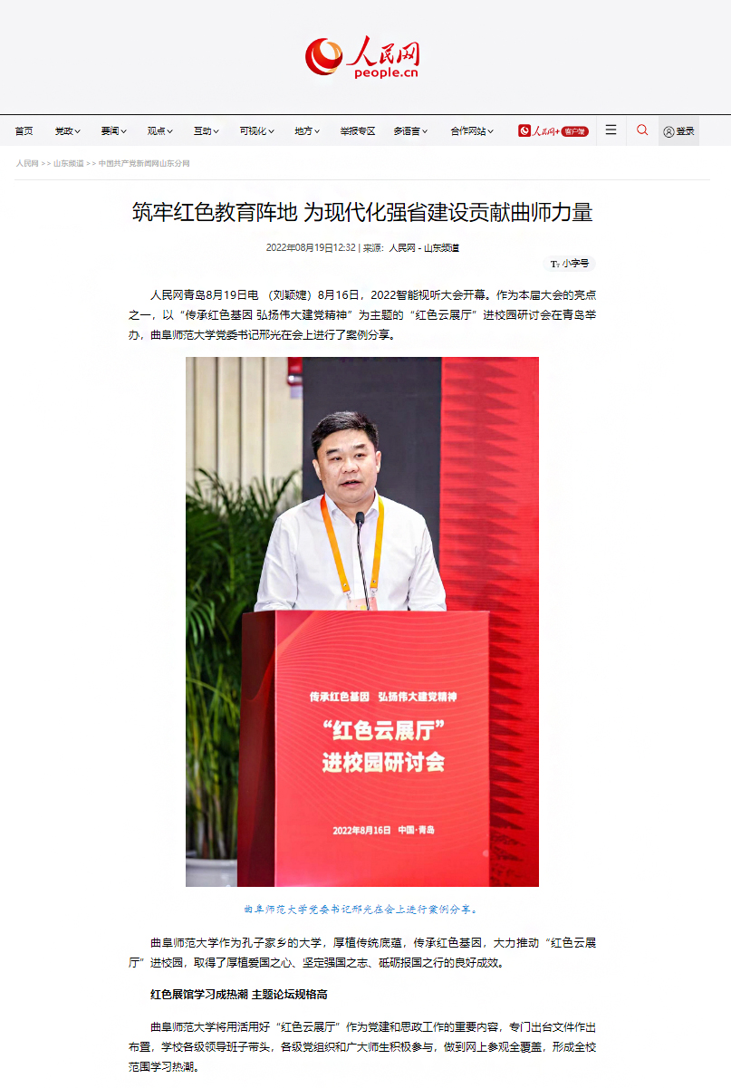8月16日,由中央网信办、人民日报社、山东省人民政府指导,青岛市人民政府、山东省委网信办、人民网主办的2022智能视听大会开幕。作为本届大会的亮点之一,以“传承红色基因 弘扬伟大建党精神”为主题的“红色云展厅”进校园研讨会在青岛举办,人民网以《筑牢红色教育阵地 为现代化强省建设贡献曲师力量》《用活用好身边资源 让红色文化融进高校思政课》为题报道了米兰网厚植传统底蕴、传承红色基因、推进立德树人的红色教育开展情况。