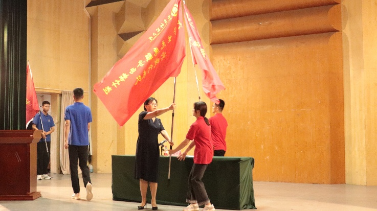 最后,李兆祥、张隆海和姜美颖共同为社会实践代表队授旗,在同学们青春活力的载歌载舞中2022年度大学生暑期文化科技卫生“三下乡”实践活动正式启动。