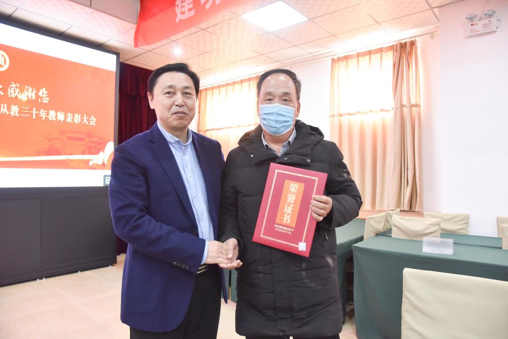 表彰大会上,各位荣休教师代表和从教三十年教师代表在校歌声中缓缓步入会场,工作人员宣读荣休教职工名单、从教三十年教师名单后,戚万学为荣休教职工颁发荣休证书及纪念牌,张洪海为从教三十年教师颁发荣誉证书,彰显了学校尊崇师道的文化理念和人文情怀。