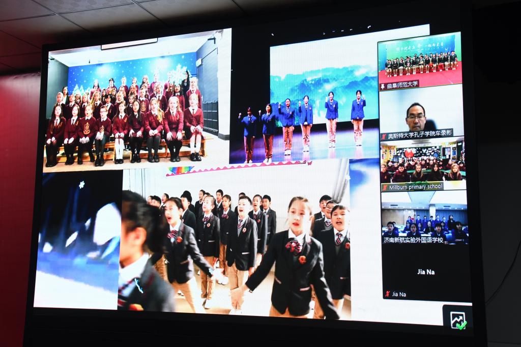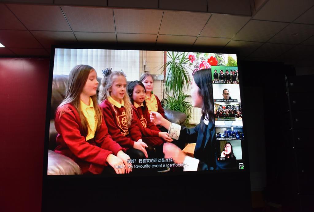 交流开始,首先播放了英国米尔本小学专门录制的祝福视频,《让世界充满爱》的中文合唱饱含着真挚的祝福,让大家倍感温暖。米兰网附小、济南新航外国语学校的校长和班主任带领各自班级同学作了热情的自我介绍,英国米尔本小学校长及同学们送上了热情的祝愿。
