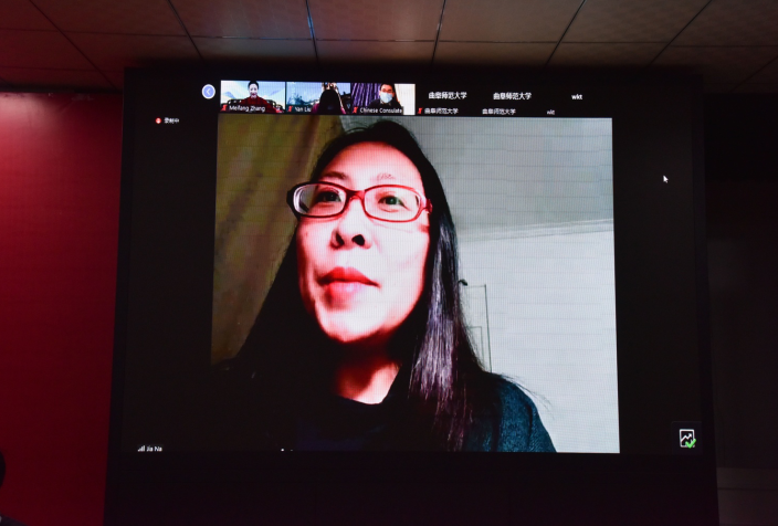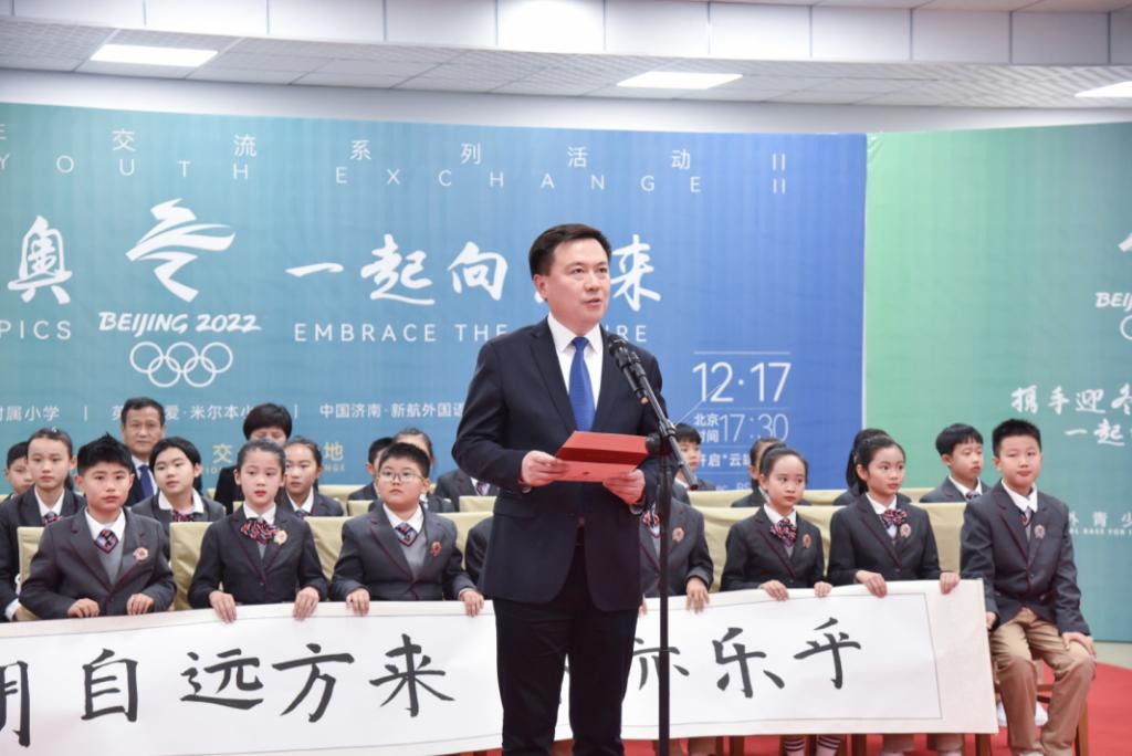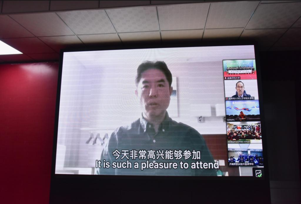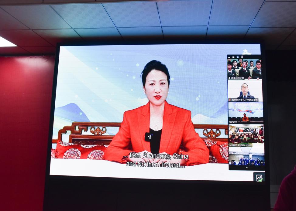 中国驻贝尔法斯特总领馆总领事张美芳,山东省人民对外友好协会秘书处处长周卫,英国驻华大使馆北爱事务局中国区行政总监贾娜,米兰网党委常委、副校长屈跃宽分别致辞,表达对于两国三地青少年交流的美好期待,共同祝福北京冬奥会及中英两国友谊。