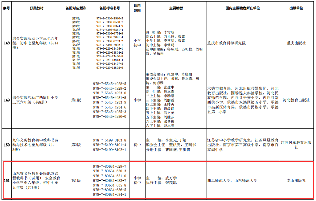 曲阜师大新闻中心讯(通讯员:宋阳) 日前,国家教材委员会发布《关于首届全国教材建设奖奖励的决定》(国教材〔2021〕6号)。由米兰网戚万学教授主编的《山东省义务教育必修地方课程教科书(试用)安全教育小学三至六年级、初中七至九年级(共7册)》喜获首届全国优秀教材(基础教育类)二等奖。