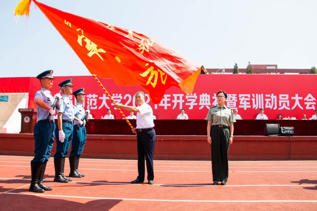 典礼上,党委书记戚万学在曲阜校区为军训旅授旗;校长张洪海在两校区讲话,寄语新同学奋力书写自己精彩的大学画卷;党委副书记扈庆学在日照校区为军训旅授旗;党委常委、副校长夏云杰、卢国强分别在两校区主持典礼。