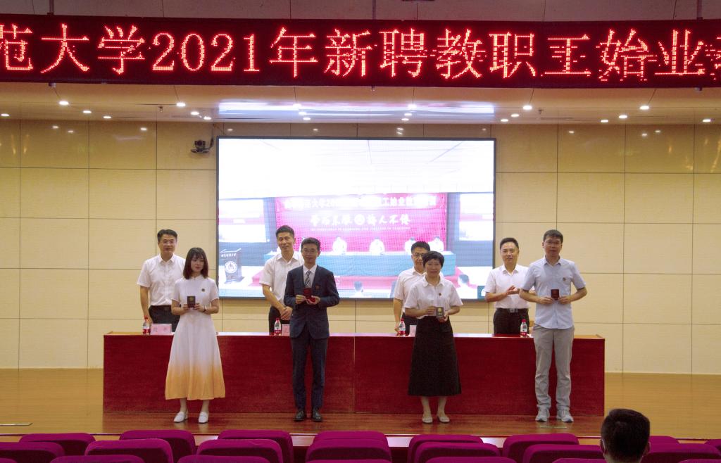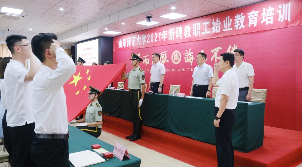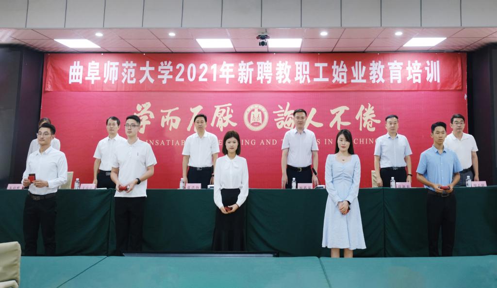 典礼上,学校领导为新聘教师代表发放校徽、工作证,希望他们以昂扬姿态开启教书育人新篇章。随后,我校150余名新聘教师进行了庄严的入职宣誓,“忠诚教育事业,履行教师职责。修身立德,行为世范;追求真理,学而不厌;传道授业,诲人不倦……”在鲜艳的五星红旗前,教师们集体作出庄重承诺,发出了立德树人、诲人不倦的曲园声音。