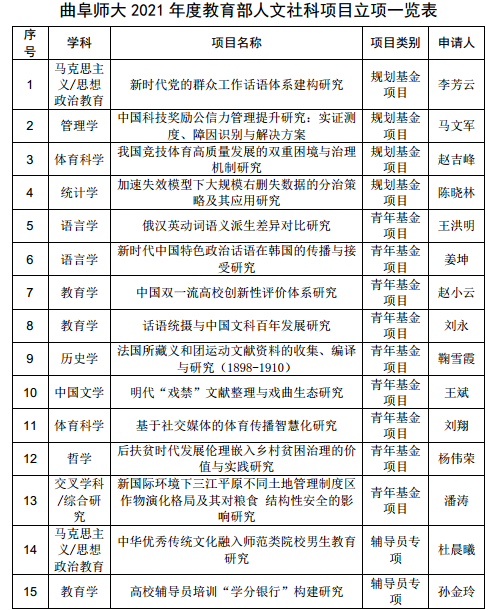 曲阜师大新闻中心讯(通讯员:刘刚旦) 8月20日,2021年度教育部人文社会科学研究一般项目立项正式公布,曲阜师大共有15个项目获批立项,其中规划基金项目4项、青年基金项目9项、辅导员研究专项项目2项,立项总数位列全国高校第25位、师范类高校第7位,连续四年位列山东省属高校第1位。