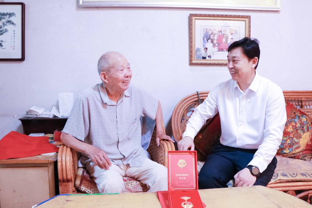 曲阜师大新闻中心讯(记者:刘萌 摄影:刘萌 李文振)在党的百年华诞即将到来之际,6月29日上午,党委书记戚万学,党委副书记、校长张洪海,党委常委、组织部部长郭庆兵分别走访慰问了建国前老党员同志,向老党员同志致以亲切问候和崇高敬意,并为他们送上了“光荣在党50年”纪念章。