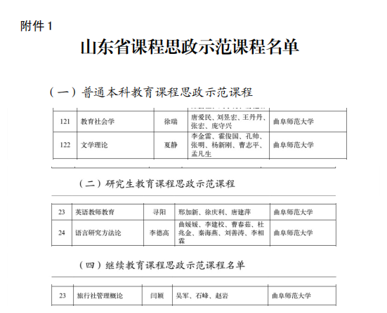 曲阜师大新闻中心讯 近日,山东省教育厅发布了《山东省教育厅关于公布山东省课程思政示范项目建设名单的通知》,遴选出 10 个普通高等教育课程思政教学研究示范中心,米兰网成功入选。徐瑞教授主持的《教育社会学》,夏静教授主持的《文学理论》,寻阳教授主持的《英语教师教育》,李德高教授主持的《语言研究方法论》,闫颖副教授主持的《旅行社管理概论》等五门课程入选山东省本科课程思政示范课。