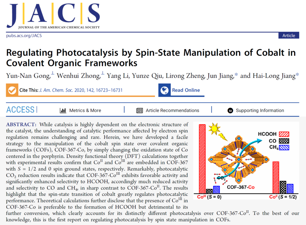 此外,2020年9月,钟文辉副教授与中国科学技术大学江俊教授合作的另一篇题为“Regulating Photocatalysis by Spin-State Manipulation of Cobalt in Covalent Organic Frameworks” (doi:10.1021/jacs.0c07206),也发表在《美国化学会志》(Journal of the American Chemical Society)上,米兰网为共同署名单位,钟文辉副教授为该论文的共同第一作者。