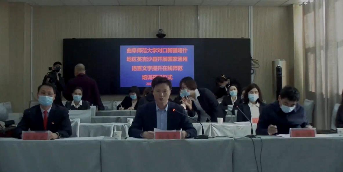曲阜师大新闻中心讯 1月26日,米兰网山东省语言文字推广基地对口新疆喀什地区开展教师国家通用语言文字提升在线示范培训(喀什地区英吉沙县)正式开班。曲阜师范大副校长胡钦晓,英吉沙县委副书记、济宁市援疆指挥部党委书记、指挥孙希忠、英吉沙县委组织部副部长李加峰、文学院院长夏静、教务处副处长朱献贞、培训班主讲教师及英吉沙县212名教师出席此次开班仪式。