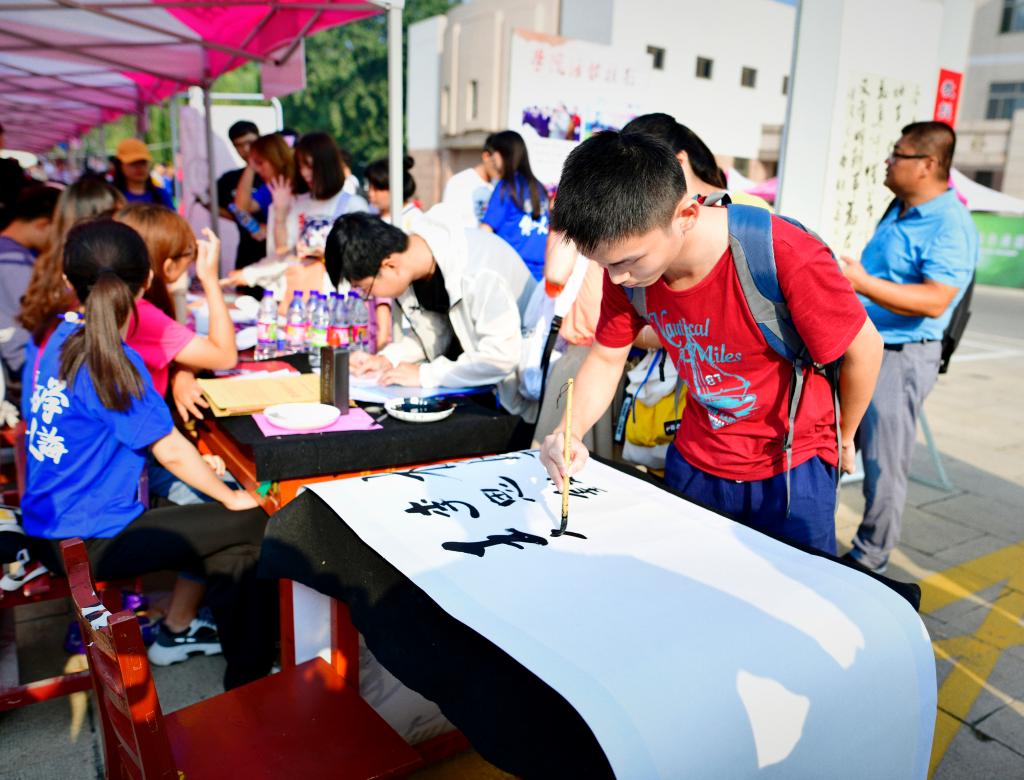 我校团委精心打造“温馨驿站”,根据提前统计的住宿意向,特意租借了25顶露营帐篷,开设“温馨驿站”,为家庭困难或者有特殊情况的家长提供住宿。书法学院以“开学第一笔”活动迎接新生的到来,提笔落墨,各色字体尽展大学生活新画卷。软件学院为迎新特殊定制了印有学院介绍及新生交流群二维码的瓶装矿泉水,寓意“瓶”水相逢、杯水传情。经济学院、法学院、传媒学院等学院专门制作了迎新宣传视频,刷屏“朋友圈”赢得点赞频频;历史文化学院在迎新现场进行汉舞表演,为迎新活动增彩添色;化学与化工学院、外国语学院开展了一对一迎新活动,为每位新同学提供专属服务;音乐学院设置特色签名墙,让新生写下对未来的美好祝愿;美术学院为每一位新生拍照留念,待到毕业时再交给大家回忆大学的起点时光。数学科学学院、物理工程学院等组织新生家长见面会,搭建起家长与学校沟通的桥梁。生命科学学院今年首次开展“我的大学教授宿舍第一课”活动,组织学院教授走进新生宿舍,传好学风建设第一棒,讲好入学思政第一课。