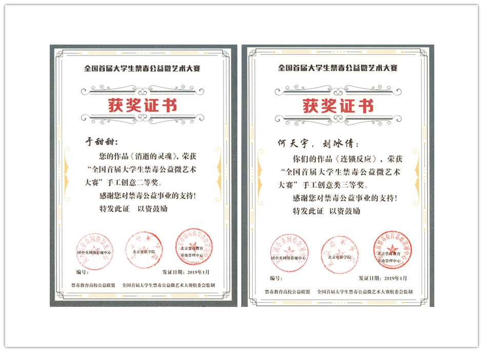 近日,全国首届大学生禁毒公益微艺术大赛获奖名单公布。由孔勇老师指导、传媒学院数字媒体艺术专业2017级学生于甜甜创作的作品《消逝的灵魂》以及数字媒体艺术专业2017级学生何天宇、刘冰倩共同创作的作品《连锁反应》,分别荣获手工创意类二、三等奖。