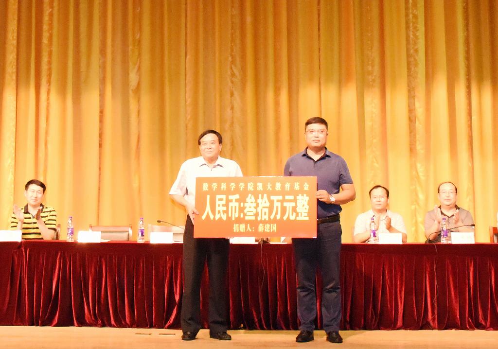 9月19日下午,我校数学科学学院举行2018级新生入学教育大会暨凯大教育基金设立仪式。副校长冯冲、辛杰,凯大教育集团创始人、我校优秀校友薛建国出席活动,国内合作处、校团委、宣传部、学生工作处、数学科学学院负责人及2018级数学科学学院新生参加活动。仪式由数学科学学院党委书记屈跃宽主持。
