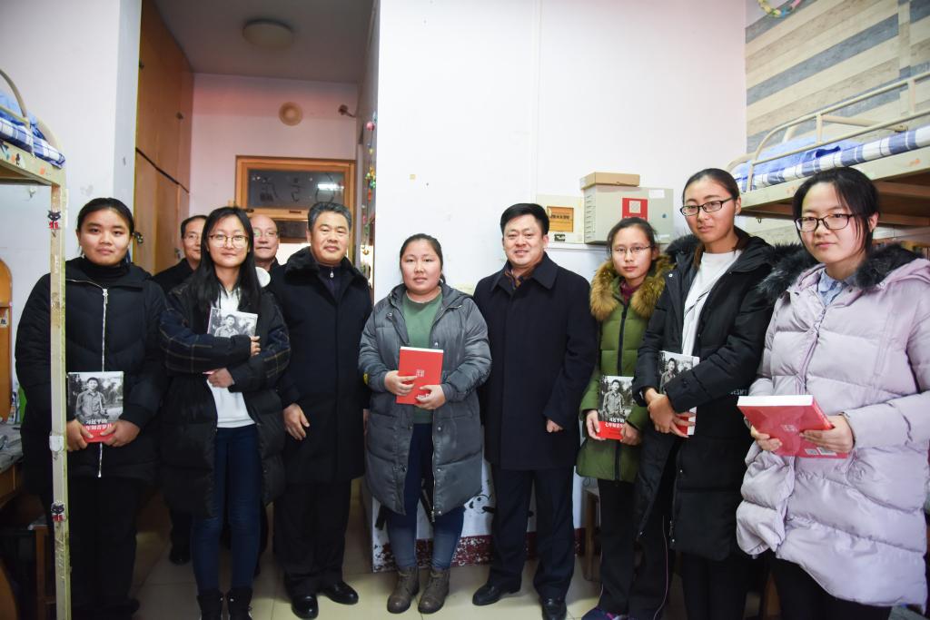 戚万学向同学们赠送了《习近平的七年知青岁月》一书,并勉励同学们说:“这本重要著作是当代青年人成长成才的‘活教材’。青年人如何为自己定位,青春要如何奋斗,人生要实现怎样的价值,读完这本书一定会找到答案。”戚万学希望同学们把这本书当作指点人生方向的案头卷,以手不释卷的钻劲、韧劲,读懂悟透“青年习近平”,从中汲取精神营养,努力扣好人生的第一粒扣子。