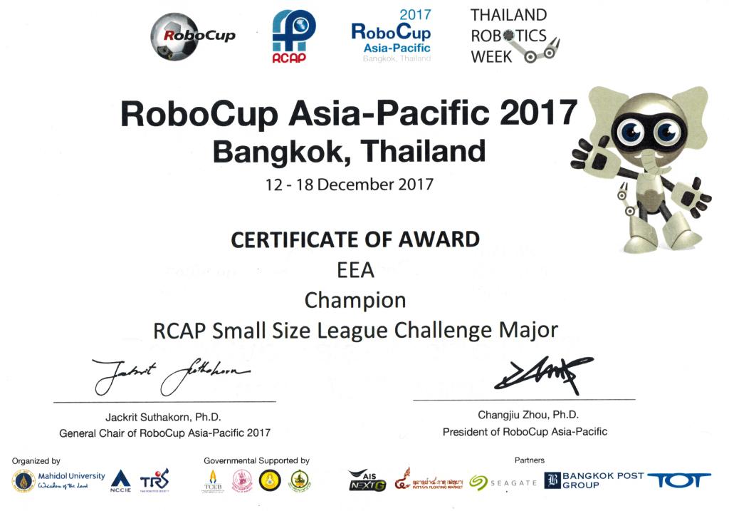 12月14日至18日,2017亚太机器人世界杯(RoboCup Asia-Pacific 2017)在泰国曼谷会展中心举行。在黄金明副教授的指导下,由我校工学院竺山、娄伟、吴大中和马国耀四位同学组成的EEA团队,在Small Size League Challenge(SSL Challenge)项目中勇夺冠军。