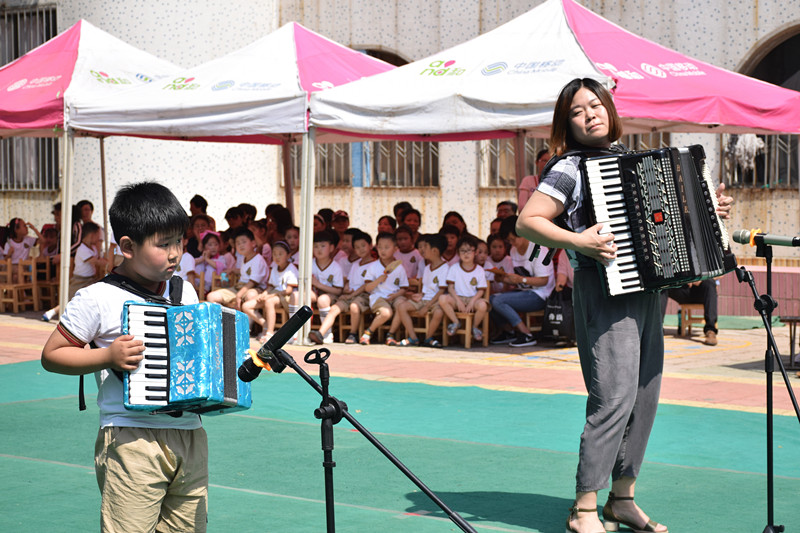在小主持人的精彩亮相中,庆“六一”文艺汇演拉开帷幕。舞蹈《孔子爷爷》、《三字经》,体现出思想性和艺术性的统一,孩子们幼稚可爱的动作引得家长们拍手叫好;吟诵朗诵《咏鹅》,让孩子感受到了传统文化的魅力;动感十足的球操表演,极富韵律的节奏加上孩子们整齐划一的动作,嗨出了孩子们的激情,让在场的家长们为之震撼;亲子节目手风琴联奏,歌曲《宝贝宝贝》,带大家走进喜庆、美好、温暖、和谐的世界。