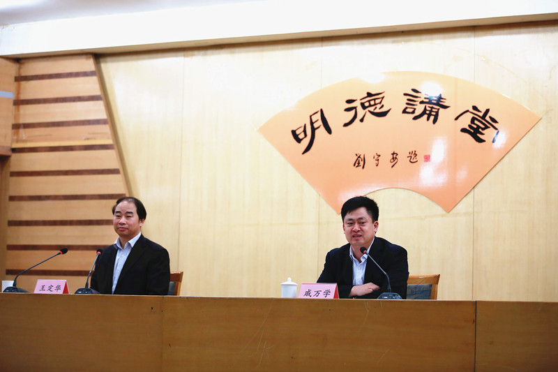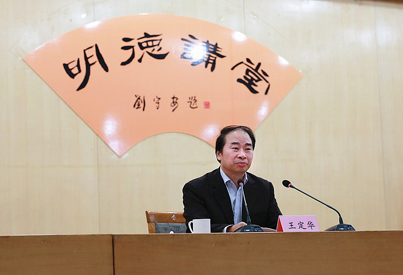 在“明德讲堂”报告会上,王定华为我校处级以上干部、高级职称人员和部分师生代表做了题为《我国教师教育振兴的政策与策略》的报告。报告站在我国教育事业发展的高度,围绕提高教育质量、促进教育公平、实现人的全面发展等问题,介绍了在深化教育改革中的四个着力:着力培养青少年的爱国主义教育,加强实践锻炼,做到德智体美劳全面发展;着力推进均衡发展,促进教育公平;学校、家庭、社会结合形成合力,着力促进人的全面、自由、充分发展和健康成长;着力专业发展,建立师德高尚、业务精湛、结构合理、充满活力的教师队伍,让教师成为令人羡慕的职业。针对加强教师队伍建设问题,王定华结合教师工作司的工作,从“深化教师教育改革”、“调整教师入职门槛”、“提高师范专业生源质量”、“注重师德教育”等八个方面做了解读。