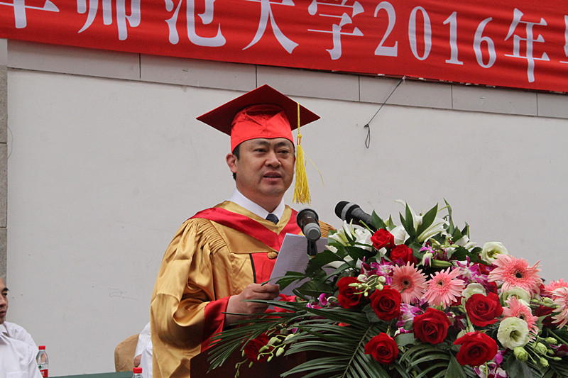 校长戚万学在典礼上致辞。戚万学代表学校向圆满完成学业的毕业生表示热烈祝贺,向为同学们的成长付出心血的老师、家长及社会各界表达最诚挚的谢意和敬意。面对即将扬帆起航的学子,他饱含深情地说:毕业了,你们有理由庆贺,因为四年来你们不断突破自己,终于破茧成蝶。大学的青春,将定格在这里;曲园的情怀,将牵起你们与这所大学一生相连,一直烙印和珍藏心间。戚万学说,六十余载砥砺耕耘,赢得万千芬芳,曲阜师大从未放弃对文化薪火相传的承诺,并以特有的品质与追求书写了孔子家乡兴教育人的“杏坛新篇”。曲园见证了同学们的努力与成长,同学们对曲园传统和精神的承当,终将使这所大学非同凡响。在新的一页即将翻开之际,戚万学以一名师者、长者的身份期盼同学们,做事时多点耐心,从容执着,因为坚持、坚守、从容较之折腾、闹腾、焦躁更要紧,更有意义;处世时守住良心,多点真诚,在变革的时代守护公义、懂得奉献绵薄、尊重他人、服务社会,不辜负自己、不辜负这个时代。戚万学最后寄语毕业生“世界很大、很精彩,背起行囊,送你出发。良心、耐心、责任、坚韧,将永远照亮你回家的路。累了,想了,静轩西路57号,等你回家!”