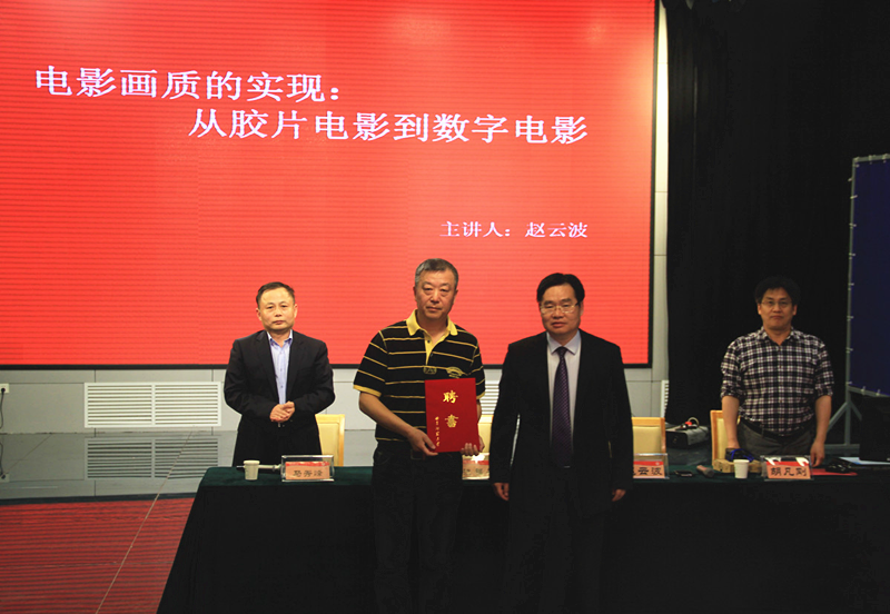 5月12日下午,山东电影制片厂创作室主任、一级摄影师赵云波先生兼职教授聘任仪式暨“电影画质的实现:从胶片电影到数字电影”学术讲座在我校举行。日照校区管委会主任助理、日照校区管理办公室主任池福安出席仪式并为赵云波先生颁发兼职教授聘书。传媒学院相关负责人、专业老师、艺术类专业研究生、相关专业本科生等170余人出席仪式并聆听了报告。聘任仪式由传媒学院院长马秀峰主持。