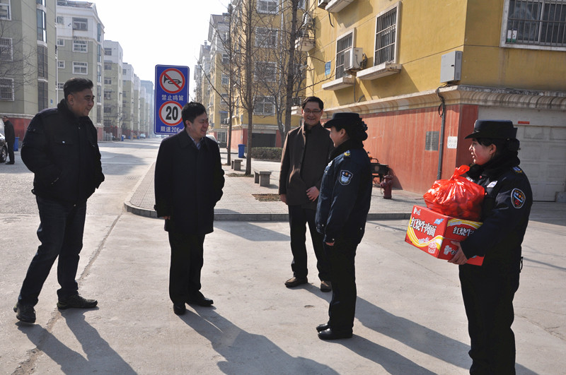 校领导先后来到门卫值班室、配电室、锅炉房、校医院、110监控中心、物业管理办公室、收发室,逐一亲切看望慰问值班人员,每到一处,校领导与大家一一握手,亲切交谈,详细询问他们的工作和生活情况,对他们春节期间坚守岗位、尽职尽责为广大师生服务表示由衷的感谢,并送上慰问品和节日的问候。