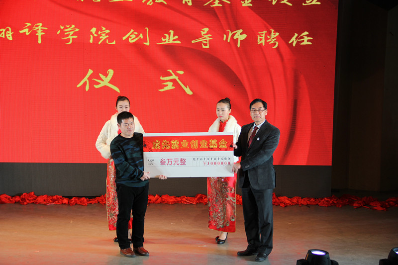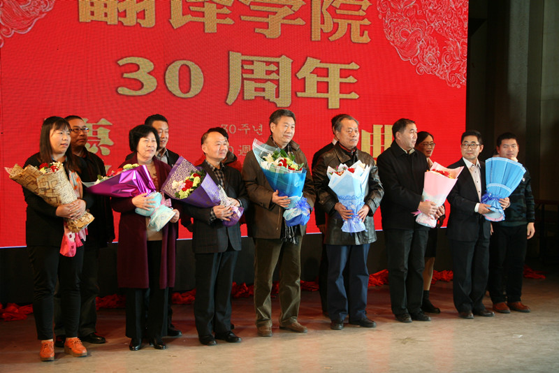 一段社会各界人士为翻译学院送祝福的视频集锦拉开了本次晚会的序幕。晚会伊始,1985级校友和在校生用诗朗诵的形式为大家带来了一场跨越三十载的对白,悠悠《犁牛之子》荡漾在舞台中央,也荡漾在每个翻译学子的心中;诗朗诵结束后,2015级同学为1985级师哥师姐们佩戴校徽,继而校友代表们为教师代表献上鲜花。三十年来,翻译学院为社会培养了大批外语人才。2004级校友张成先从上海专程赶来参加院庆活动,院长卢卫中对张成先董事长为学院捐赠创业教育基金表示感谢,并为他颁发米兰网翻译学院创业导师聘书。