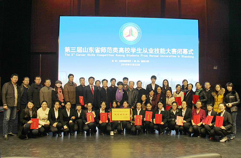 11月20-22日,第三届山东省师范类高校学生从业技能大赛省级决赛在鲁东大学举行,全省共有22所师范类高校300名选手参加比赛。我校27名学生参加决赛,其中学校推荐14人,教育厅随机抽取13人。经过激烈角逐,我校选手大获全胜,13人获得一等奖,4人获得二等奖,10人获得三等奖,我校获得优秀组织奖,获奖率和一等奖获奖人数居参赛高校之首。我校高中组语文组一等奖获得者王秋艳同学,代表获奖选手在闭幕式上作了大会发言。