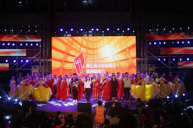由学生演绎的原创歌曲《走进曲园》正式拉开晚会序幕。舞蹈《盛世欢歌》与《悸动》,以青春的舞步、灵动的姿态,表达对曲园六十周年校庆的祝福;相声《我的大学生活》与小品《扰民》以诙谐的语言、幽默的演绎将新生军训期间发生的趣事展现的淋漓尽致,引来阵阵笑声;在读研究生代表与校园十佳歌手代表共同演绎《车站》,美妙的歌声凝聚了校友情怀,唤起不同年代的校友对曲园求学岁月的美好回忆,在校友与同学之间形成了互动与共鸣;情景剧《曲园,您好!》表现了曲园学子放眼未来、争做栋梁的追求;街舞《bang bang bang》与《SWAG》以动感十足的舞步,彰显青春的激昂和自由奔放;全体留学生带来的大合唱将晚会推向高潮,传统民歌与奔放的西方文化相碰撞,点缀了色彩斑斓的夜晚;教师代表表演的舞蹈《西域风情》,让大家尽情领略异域风采,以教师的方式献礼校庆,赢得经久不息的掌声;歌曲《节日欢歌》,以欢快的歌声献礼学校六十岁生日。“萃华月,西联灯,春风杏坛弦歌声……”晚会在合唱校歌《犁牛之子歌》中落下帷幕。