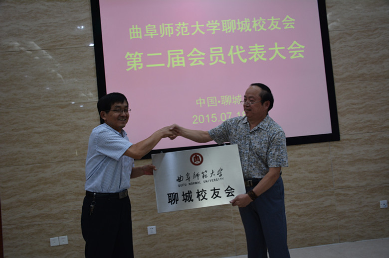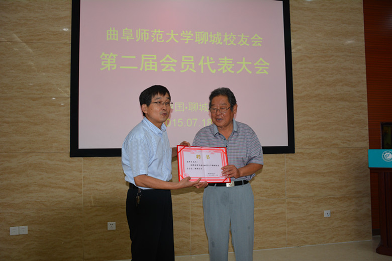 王继锁副校长向聊城校友会授会牌,赠送纪念品《孔子行教图》,向张泮舟会长颁发了聘任证书。