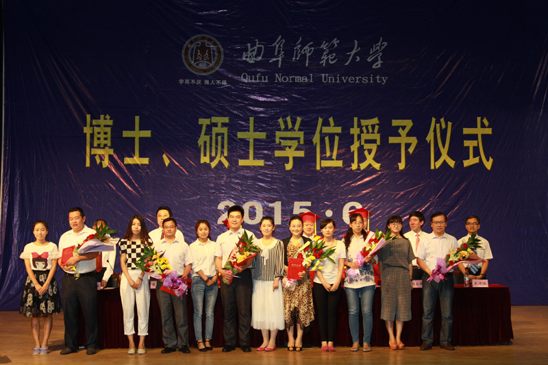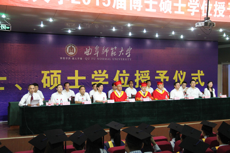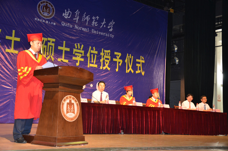 6月24日、26日上午,我校2015届博士、硕士学位授予仪式暨表彰大会分别在曲阜校区大学生活动中心礼堂和日照校区图书馆学术报告厅隆重举行。校长、学位委员会主席戚万学,副校长马东骅,副校长、学位委员会副主席康淑敏,副校长、学位委员会副主席张洪海,副校长杨冰出席授予仪式,校学位委员会委员、职能部门负责人、研究生导师代表、各学院负责人、2015届博士、硕士学位获得者及其亲友团参加了授予仪式。仪式由研究生处处长、校学位委员会办公室主任李兆祥主持。