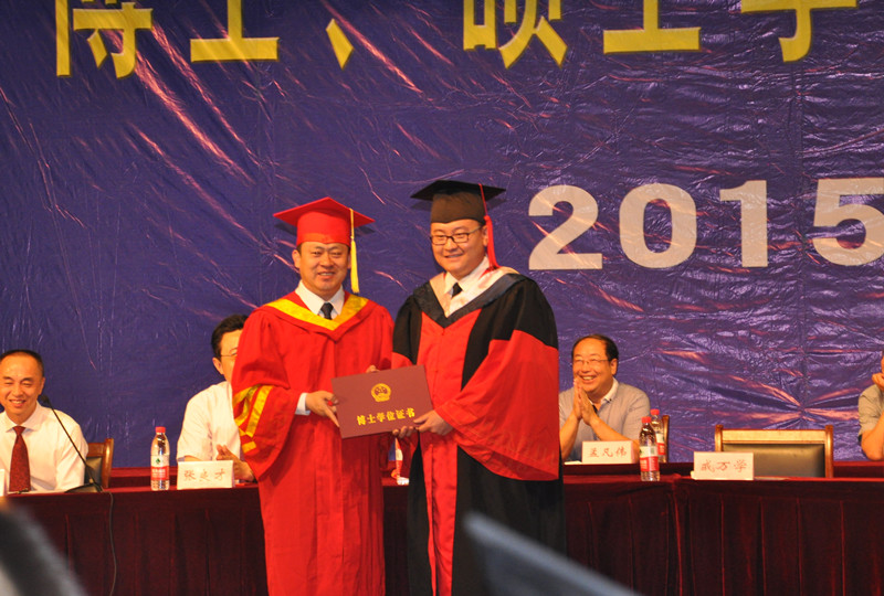 在优美的乐曲中,校长、校学位委员会主席戚万学亲自为博士、硕士学位获得者拨苏正冠、颁发学位证书并合影留念。20位博士学位获得者、1148位全日制硕士学位获得者走上主席台,在这光荣而神圣的时刻,为三年的博士、研究生生活画上了圆满的句号。