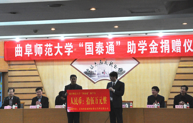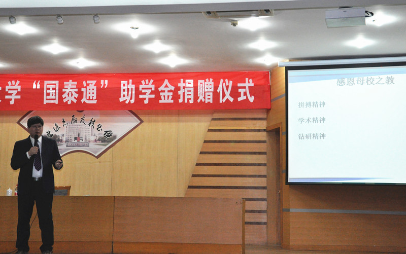 演讲之前,举行了“国泰通”助学金捐赠仪式。副校长扈庆学,学生工作处、招生就业处、校团委、体育科学学院等单位负责人出席活动,仪式由校党委办公室主任夏云杰主持。扈庆学在讲话中充分肯定了孙国成校友的杰出成绩,以及其对母校的慷慨捐赠和拳拳情意,代表学校接受其十五万元人民币的捐款。孙国成也表达了自己对母校的深深眷恋之情和感恩之心,并表示会一如既往地关心学校的发展,加强与学校的联系与合作。仪式上,孙国成与我校签订了米兰网“国泰通”助学金合作协议书,并受聘为我校就业创业导师。“国泰通”助学金的设立旨在表彰家庭贫困、品学兼优的优秀学子,首批50名同学获得资助与表彰。