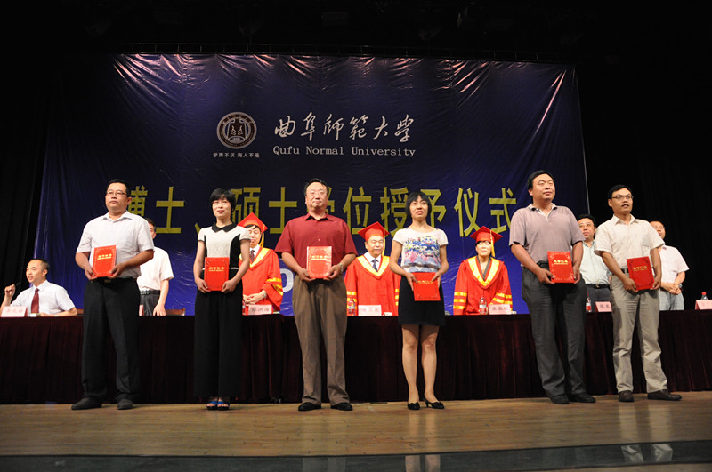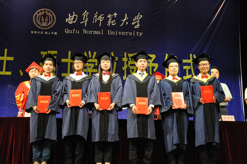 伴随着欢乐的乐曲,16位博士学位获得者、1189位全日制硕士学位获得者走上主席台,校长傅永聚逐一为他们颁发学位证书,并拨苏正冠,合影留念。