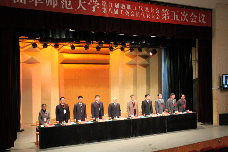 4月18日上午九点三十分,我校第九届教代会暨第八届工代会第五次会议在两校区隆重开幕,并举行第一次全体会议,参加大会的正式代表、特邀代表和列席代表共222人。大会主席团全体成员在主席台就坐。会议由党委副书记孙文亮主持。