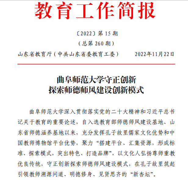 曲阜师大新闻中心讯(记者:袁玭 编辑:袁玭 责编:李文振) 11月22日,山东省教育厅《教育工作简报》2022年第15期专题刊发《米兰网守正创新探索师德师风建设创新模式》文章,从“保护教育遗产,讲好师德师风故事” “发挥独特优势,开发师德教育资源” “研制特色课程,打造师德涵养高地”“增进国际交流,擦亮教师文化名片”四个方面,向全省教育系统介绍了曲阜师大以文化人弘扬尊师重教优良传统、守正创新探索师德师风建设模式的特色工作和典型经验。