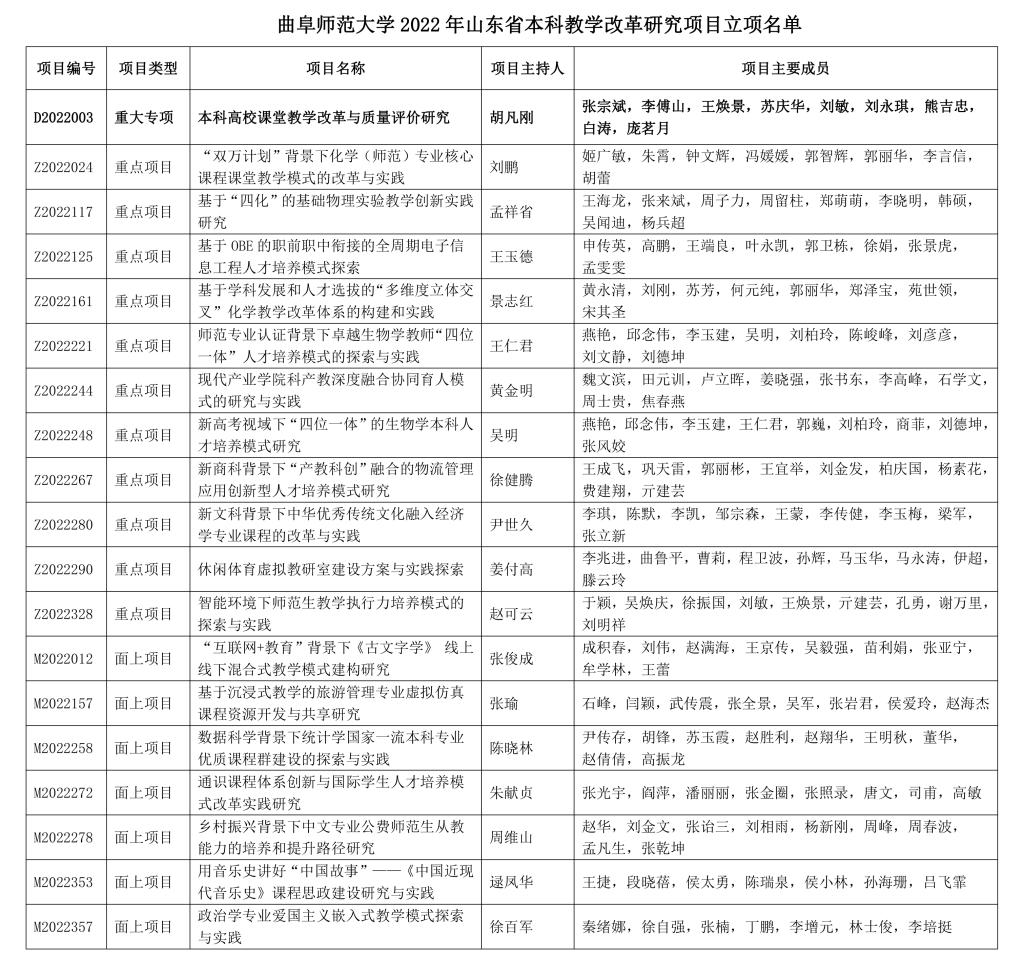 曲阜师大教务处讯 近日,山东省教育厅公布了2022年山东省教学改革研究项目立项名单,项目实行限额申报,我校共有推荐申报名额19项,全部获得立项,立项率100%。其中重大专项1项、重点项目11项和面上项目7项,立项总数位居省属高校第4位。