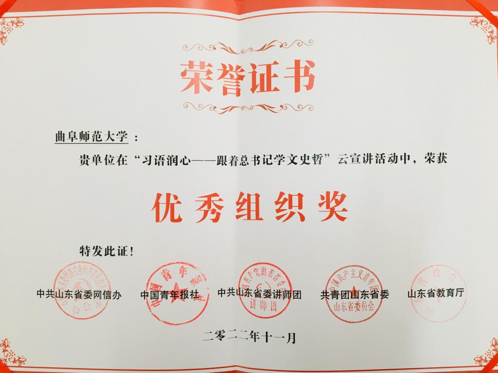 曲阜师大党委宣传部讯 近日,山东省教育厅公布了“习语润心——跟着总书记学文史哲”云宣讲活动获奖名单,曲阜师大李兆祥教授《为政以德,譬如北辰,居其所而众星共之》,宋立林教授《己欲立而立人 已欲达而达人》,周海生副教授《学而不习则罔 思而不学则殆》榜上有名,学校荣获优秀组织奖。