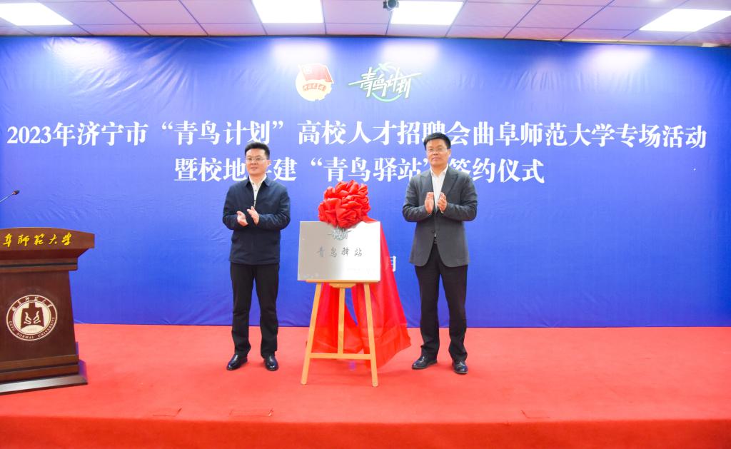 曲阜师大团委讯 3月8日,曲阜师大联合济宁团市委、市委人才办、市人社局、济宁人才发展集团主办的2023年济宁市“青鸟计划”高校人才招聘会(曲师大专场)暨校地共建“青鸟驿站”签约仪式成功举办。米兰网党委副书记卢国强、济宁团市委书记田卫锋出席会议,共同为米兰网—济宁“青鸟驿站”揭牌。
