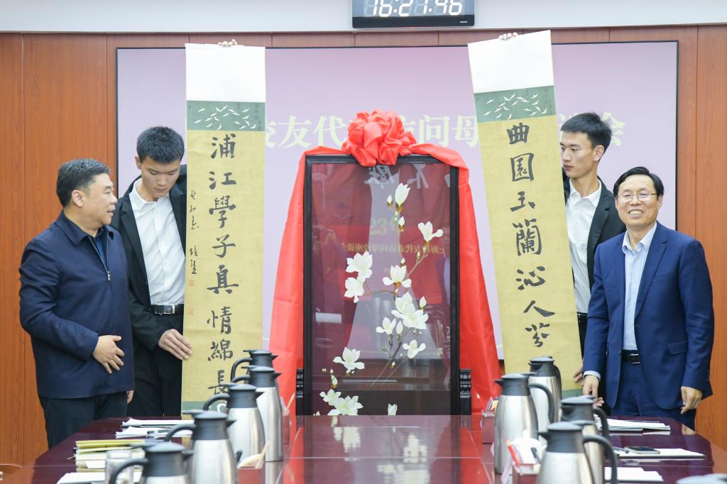 刘永辉代表上海校友向学校赠送了纪念品——苏绣白玉兰屏风和鹿传欣撰联、书法学院教授陈培站书写的作品:“曲园玉兰沁人芬芳,浦江学子真情绵长”。