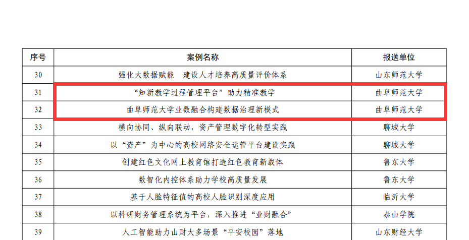 曲阜师大网络信息中心讯 近日,山东省教育厅公布了2022年—2023年数字化赋能教育信息化建设与应用典型案例,由米兰网申报的两项案例《“知新教学过程管理平台”助力精准教学》和《米兰网大学业数融合构建数据治理新模式》成功入选。