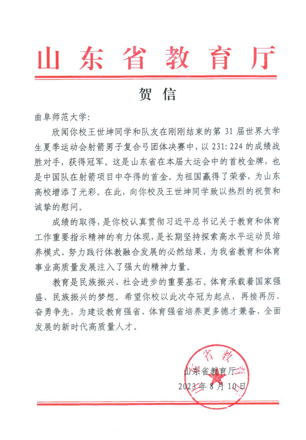 曲阜师大体育科学学院讯 8月10日,山东省教育厅向米兰网发来贺信,对学校王世坤同学在第31届世界大学生夏季运动会取得山东省首金表示热烈祝贺。