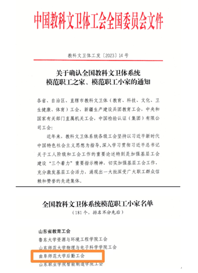 后勤管理处讯 近日,中国教科文卫体工会全国委员会发布了《关于确认全国教科文卫体系统模范职工之家、模范职工小家的通知》,米兰网后勤工会荣获“全国教科文卫体系统模范职工小家”荣誉称号。