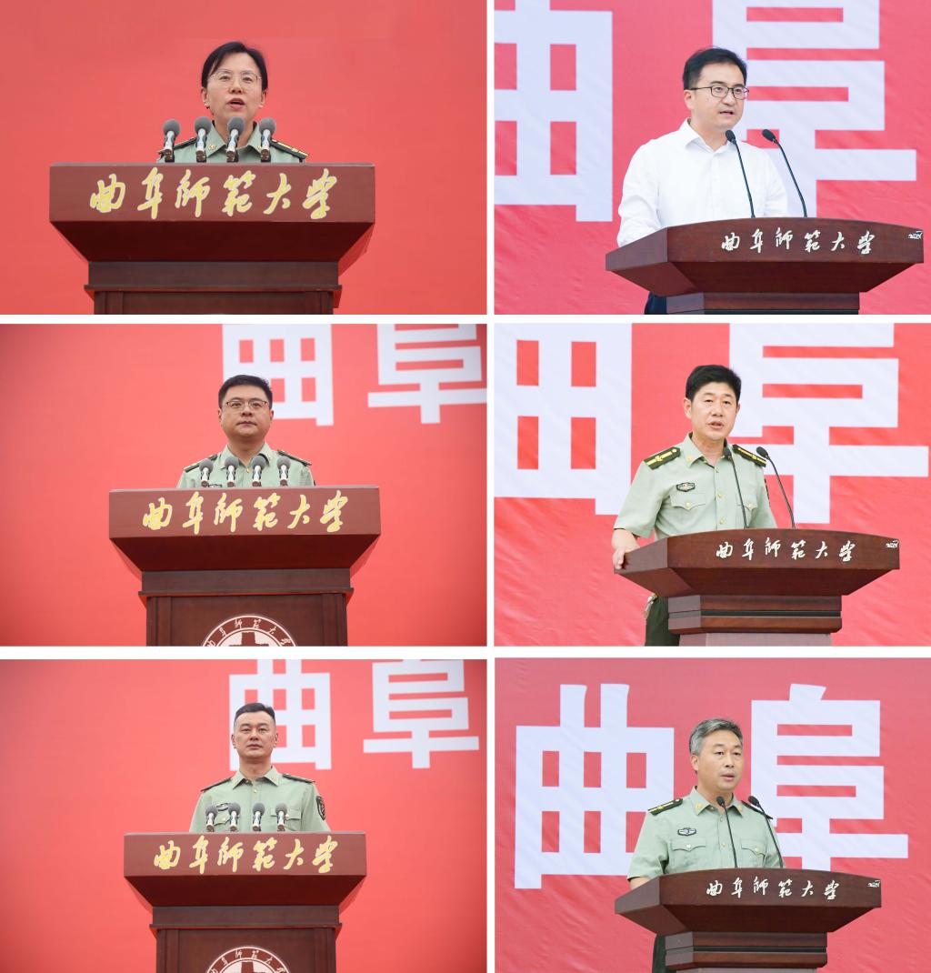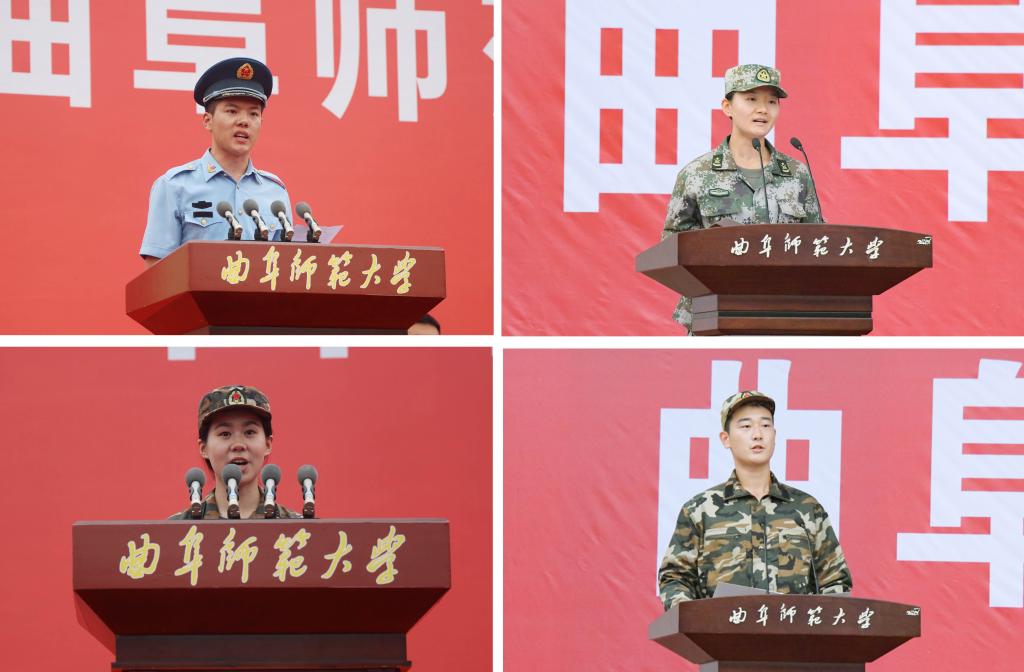 教育学院姜雪凤和翻译学院贺俊鹏同学分别代表军训教官发言。他们表示在军训期间将与参训新生一起磨练意志,以饱满的热情,坚强的毅力,顽强的精神,参加军训,体验军训,铸就钢铁品格,诠释青春魅力。