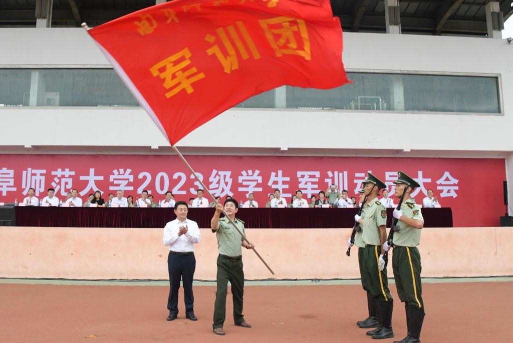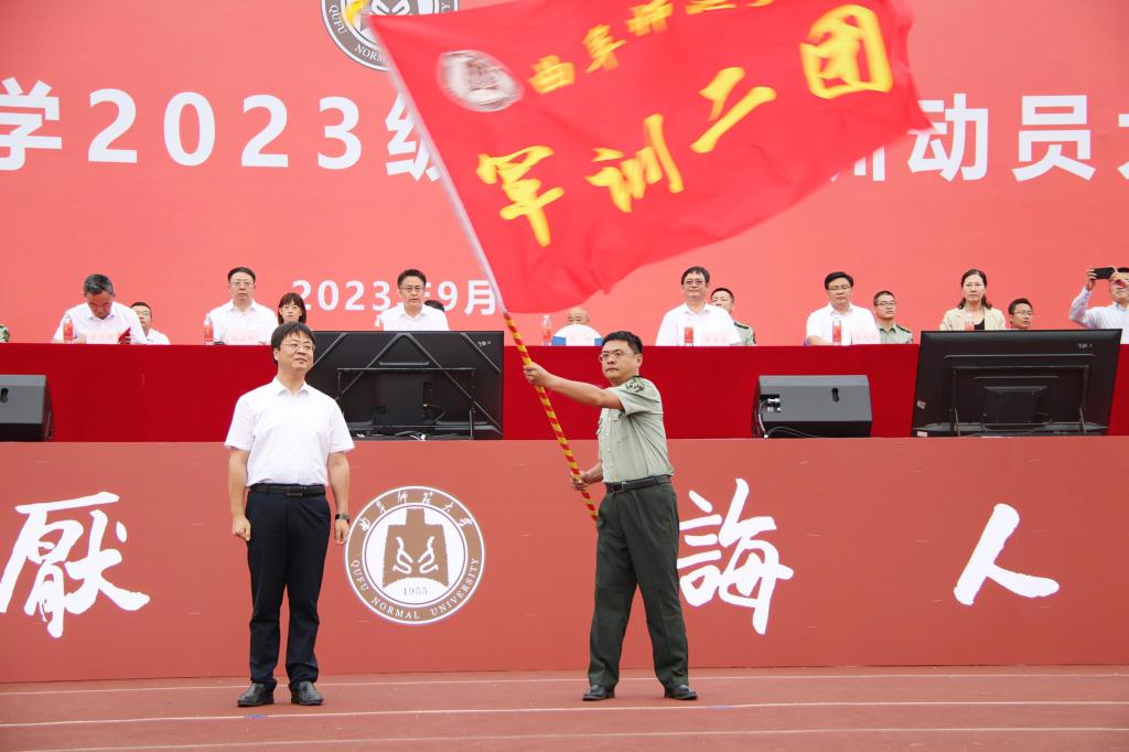 学校党委常委、副校长纪洪涛和学校党委常委、副校长刘刚分别向军训旅授旗,武装部副部长、军训一团团长赵秀臣和学生工作处副处长、军训二团团长郑勇接旗。