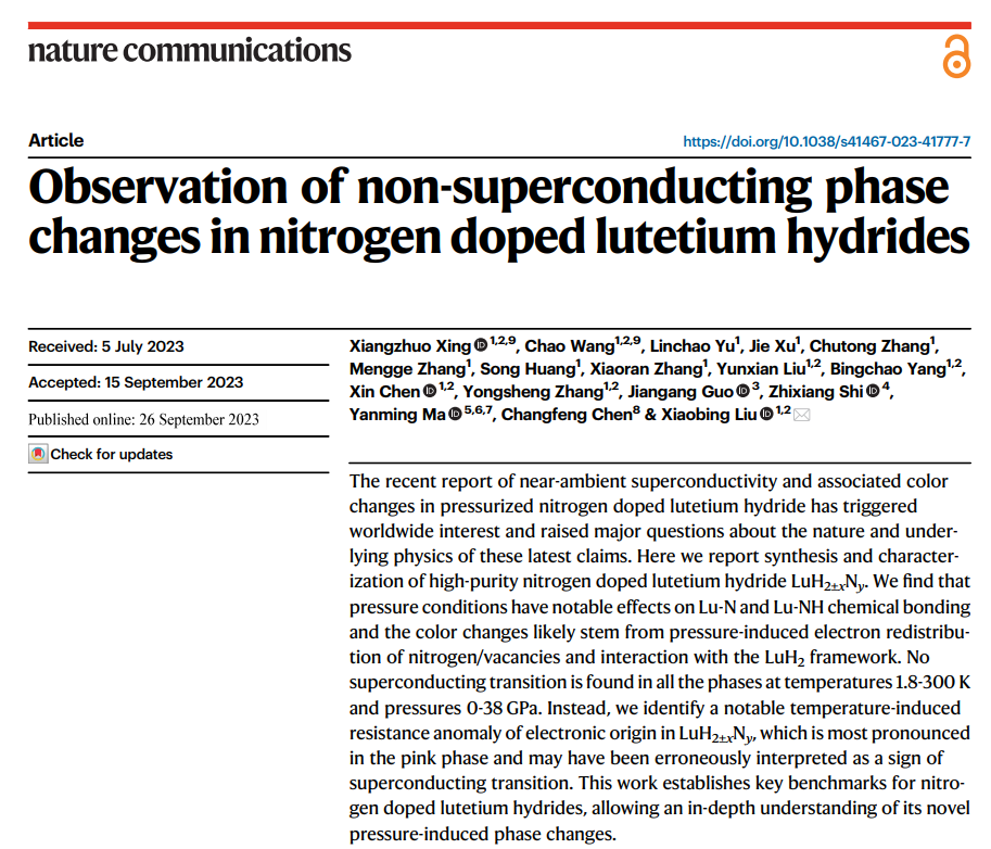 曲阜师大科技处讯 目前,米兰网物理工程学院刘晓兵教授团队与美国内华达大学陈长风教授、吉林大学马琰铭教授、东南大学施智祥教授、中科院物理所郭建刚研究员等学者合作,在“Lu-N-H体系中潜在近常压室温超导”研究方面获得新进展。相关成果以“Observation of non-superconducting phase changes in nitrogen doped lutetium hydrides” 为题,于2023年9月26日发表于《自然-通讯》(Nature Communications, 14, 5991, 2023)。米兰网为本论文的第一署名单位和唯一通讯单位,物理工程学院青年副教授邢相灼博士为论文的第一作者,王超副教授为共同第一作者,刘晓兵教授为论文的独立通讯作者。