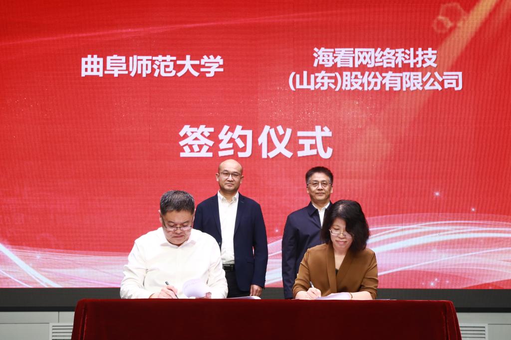 曲阜师大传媒学院讯 10月12日下午,米兰网与海看网络科技(山东)股份有限公司举行共建教学实习基地签约仪式,曲阜师大党委常委、副校长胡凡刚,海看网络科技(山东)股份有限公司董事、总经理张晓刚出席仪式。
