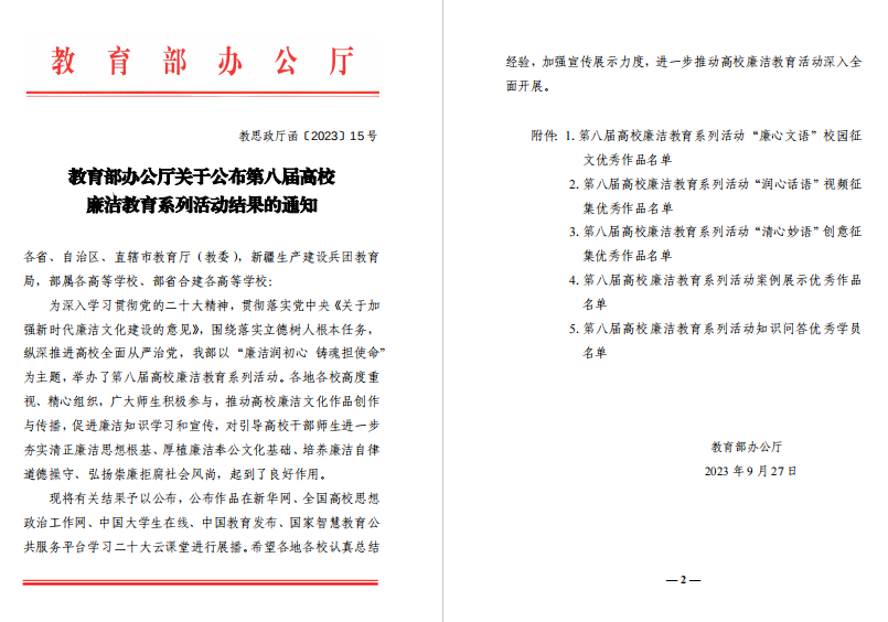 据悉,本次廉洁教育系列活动中共设置了“廉心文语”校园征文、“润心话语”视频征集、“清心妙语”创意征集、优秀工作案例展示和知识问答五大类别,每个类别作品各评选出100件优秀作品。学校党委积极响应、精心组织,在全校范围内共推选征文36项、视频8项、创意作品19项、工作案例1项,参加山东省和教育部评选。