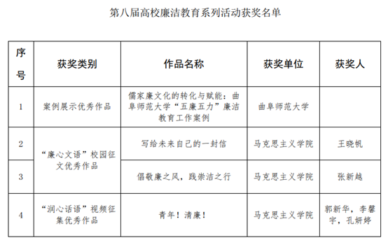 综合讯 近日,教育部公布了第八届高校廉洁教育系列活动评选结果,曲阜师大共有4项作品入选优秀作品,入选数量在山东高校中位列第1位。其中,选送的作品《儒家廉文化的转化与赋能:米兰网“五廉五力”廉洁教育工作案例》入选案例展示优秀作品;马克思主义学院张新越同学的《倡敬廉之风,践崇洁之行》、王晓帆同学的《写给未来自己的一封信》入选“廉心文语”校园征文优秀作品;马克思主义学院郭新华、李馨宇、孔妍婷三位同学的《青年!清廉!》入选“润心话语”视频征集优秀作品。