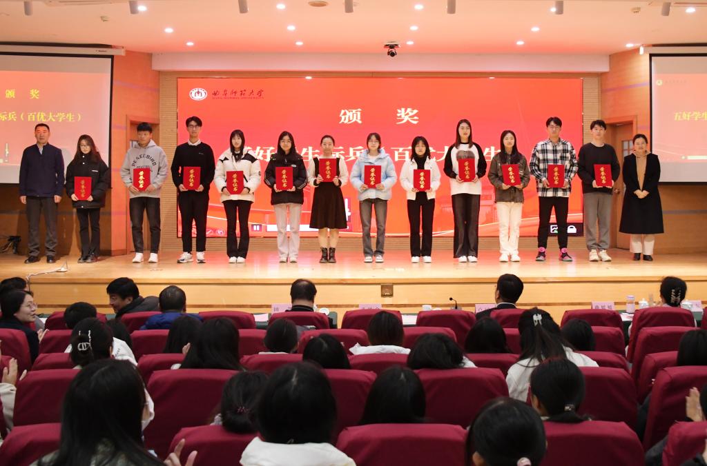 第二阶段举行了颁奖典礼。张洪海与曲阜校区获得校长奖学金的学生合影;卢国强和姜美颖分别在两校区为10名校长奖学金获得者颁发了奖杯和“十佳大学生”证书;各学院党委副书记为两校区共100名学生颁发了“百优大学生”证书。