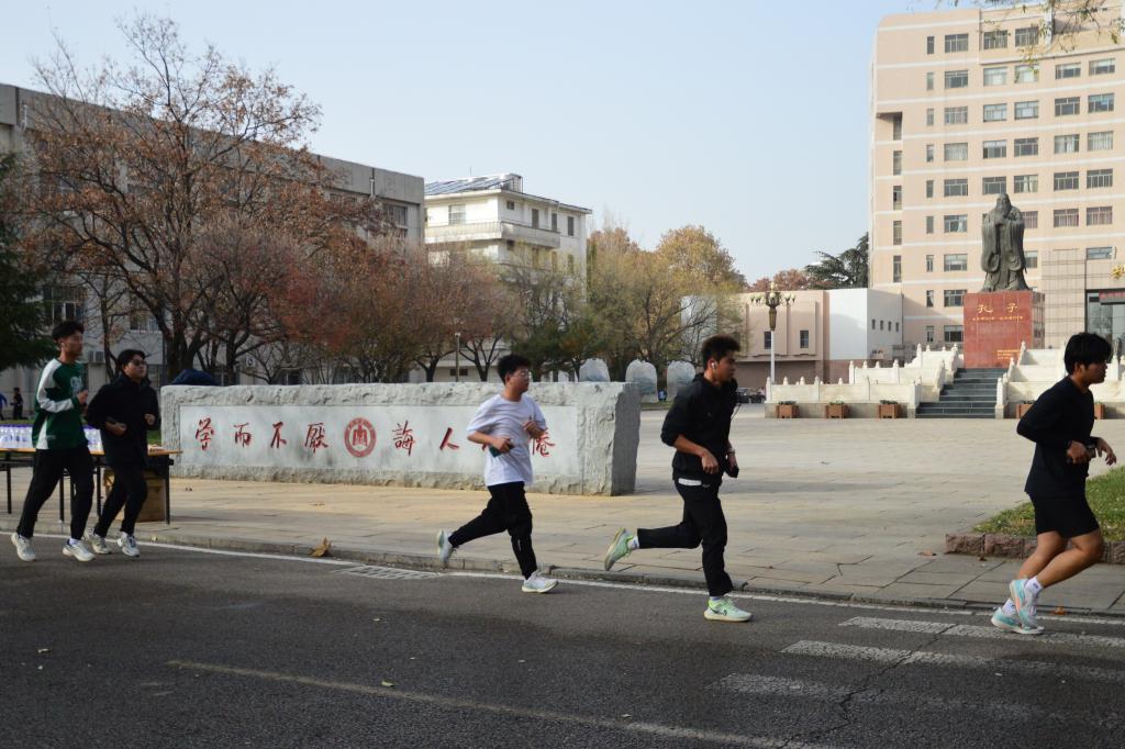 本次环校跑全程4公里,赛事起点和终点为逸夫学术交流中心,途经致知楼、格物楼、教师博物馆、孔子文化广场、综合教学楼等标志性建筑。沿途设有4个补给站,补给站除了为参赛选手提供路线引导、能量补给、应急医疗等服务外,还设置了抽签答题环节,参赛选手需要回答“一二·九”运动相关知识问题,增加趣味性的同时丰富了活动内涵。