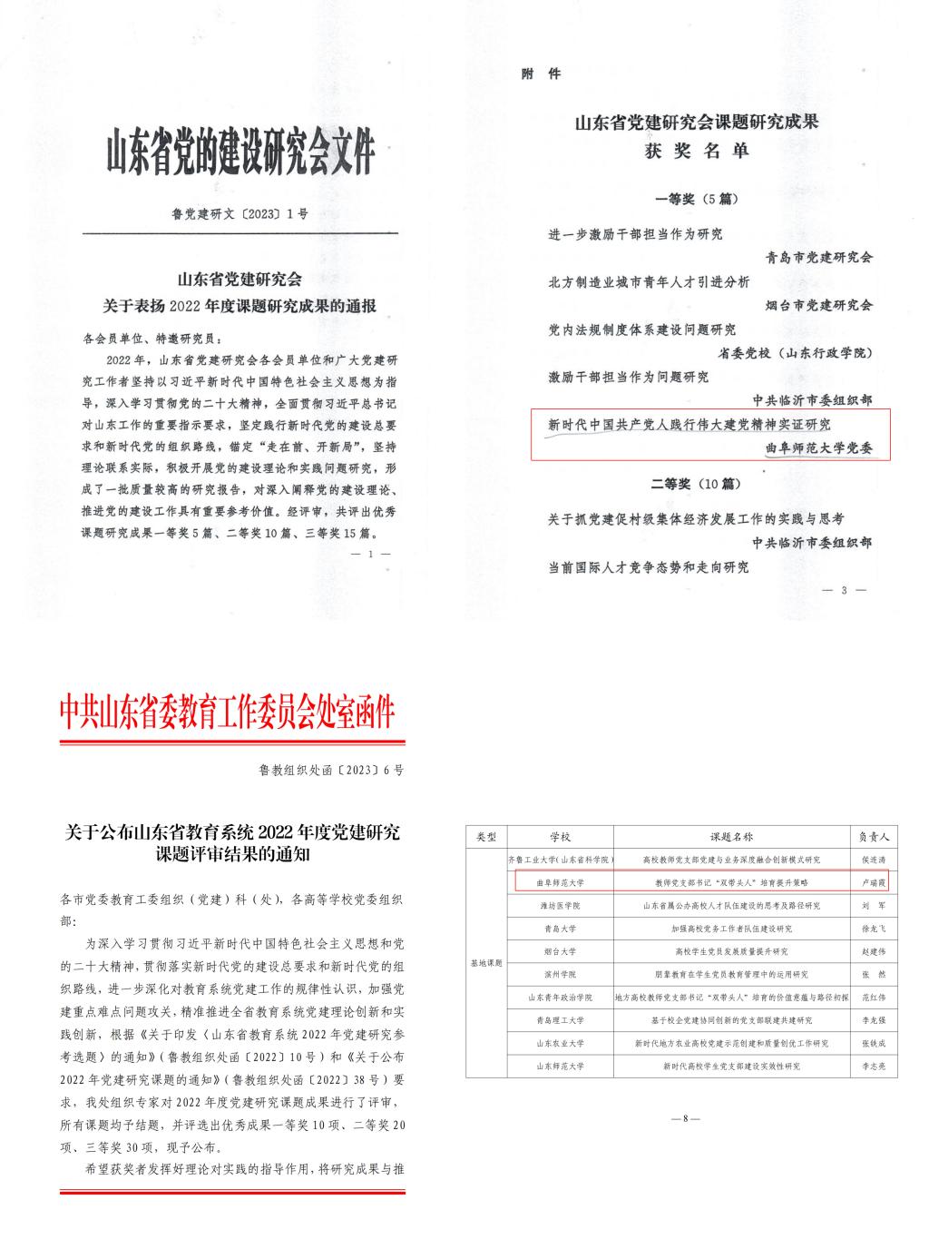 曲阜师大党委组织部讯 近日,学校基层党组织和党员队伍在上级各类评选表彰中再获得多项荣誉。生命科学学院王仁君率领的生物多样性保护与利用团队,获评“全省教育系统共产党员先锋岗”;计算机学院尚军亮荣获“全省教育系统党务工作先锋”称号;数学科学学院刘丽被授予“济宁市优秀共产党员”称号;经济学院王艳同志被授予“济宁市优秀党务工作者”称号;教育学院党委被授予“济宁市先进基层党组织”;马克思主义学院陈庆国撰写的“新时代中国共产党人践行伟大建党精神实证研究”,获全省党建研究会课题研究成果一等奖;政治与公共管理学院卢瑞霞主持的课题“教师党支部书记‘双带头人’培育提升策略”顺利结题并获三等奖。